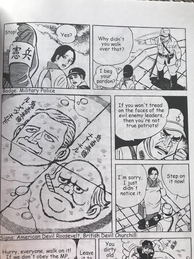 宪兵强迫老百姓踩踏鬼畜罗斯福和鬼畜丘吉尔的画像,“不踩不是日本人”